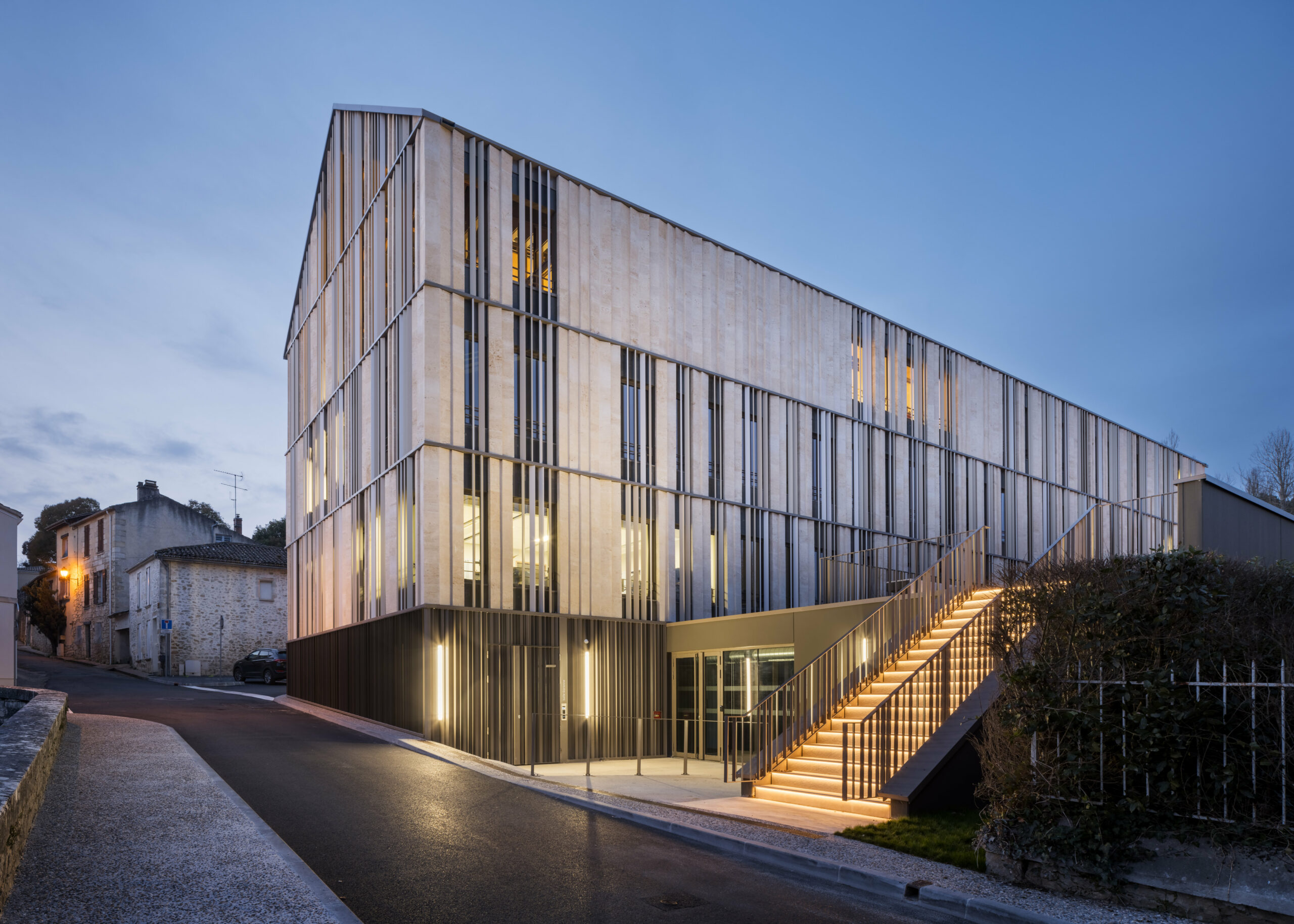 D’un charisme discret et bienveillant, l’édifice reflète les valeurs de son territoire : sobriété, utilité publique et engagement dans la transition énergétique. Sa volumétrie simple, rythmée par une trame verticale en pierre locale aux teintes calcaires, confère au bâtiment une présence évolutive, vibrant au fil des lumières et des saisons.