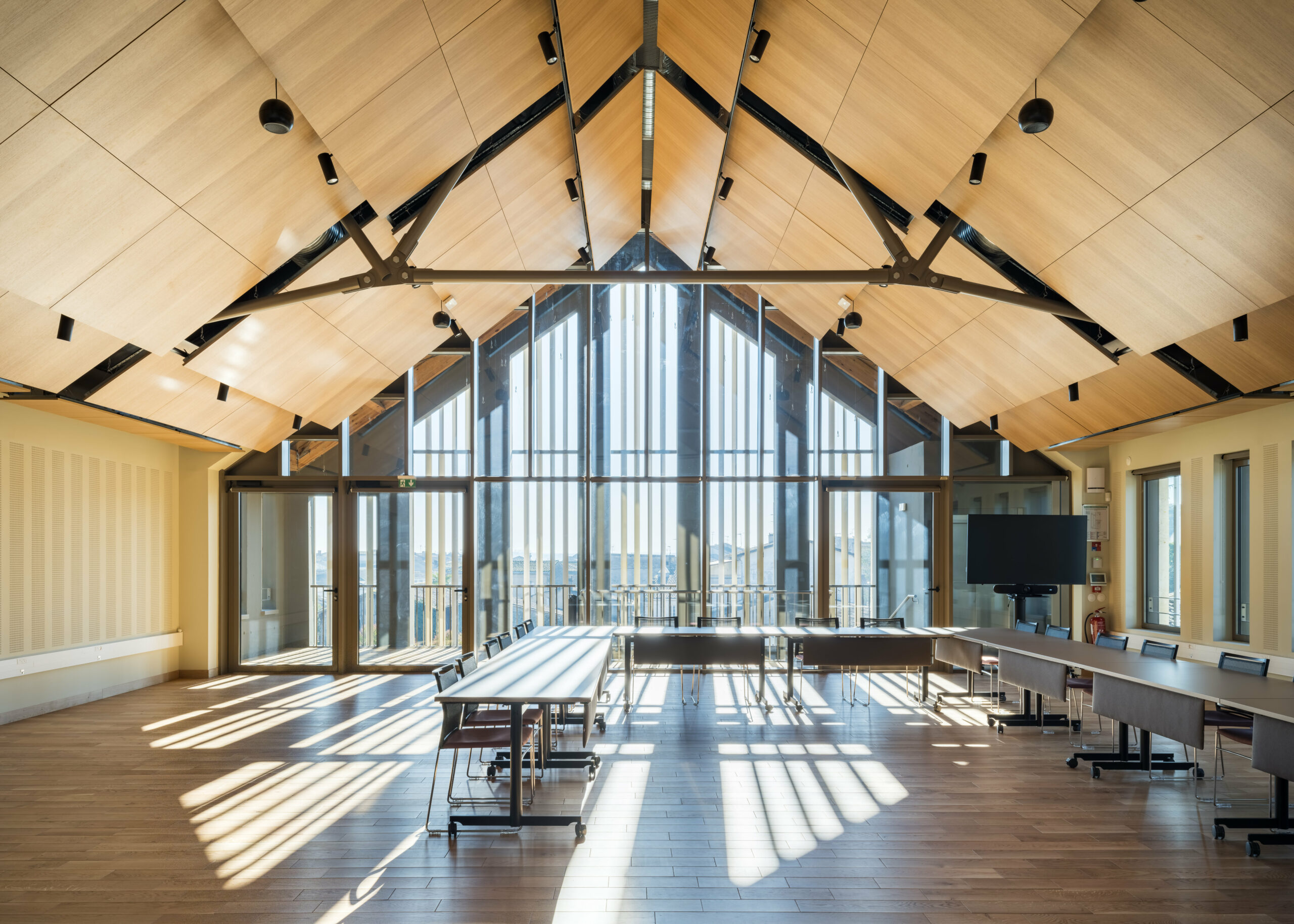 En panorama sur le territoire Réolais Sud Gironde, la salle de conseil à l’ambiance chaleureuse, se prolonge d’une terrasse privative au Sud. Arthur Péquin photographe – GUIRAUD-MANENC Architecture – MSP La Réole, 2024.