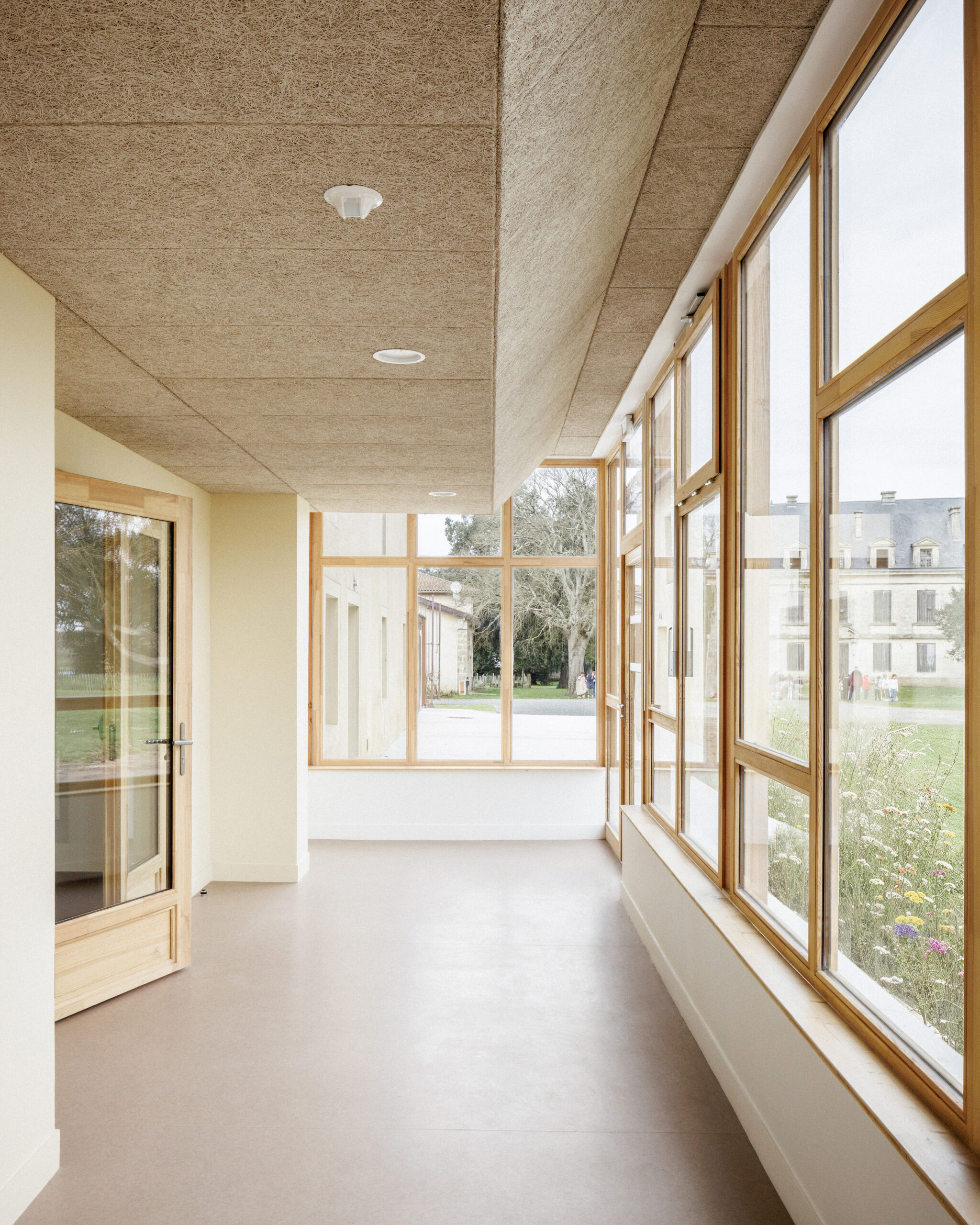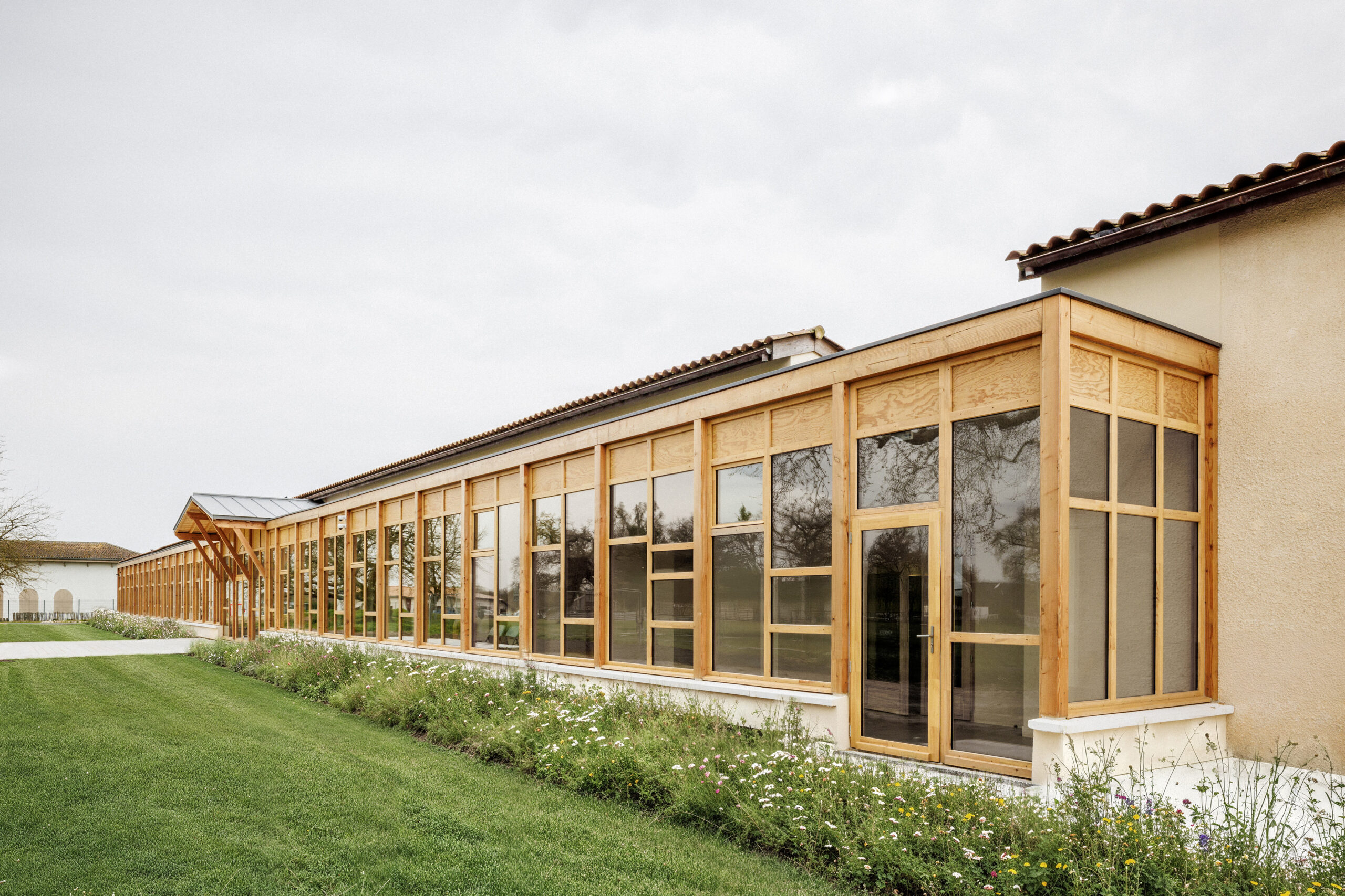 L'intervention architecturale ajoute une galerie vitrée longeant la façade Est, avec une ossature en bois clair et de grandes baies ouvrant sur le parc. Cette galerie unit les espaces existants, offre une lumière naturelle abondante et crée un dialogue harmonieux entre l'ancien bâti, l’extension contemporaine et le parc. Un porche marque l'entrée principale, affirmant la nouvelle identité du lieu. Le projet réinvente également le rapport au paysage. De nouveaux cheminements piétons et un parvis d'accueil ouvrent l'école sur son environnement, créant une perméabilité entre culture et nature, facilitant les circulations entre équipements. L'utilisation du bois français, primée par la Fondation France Bois Forêt, témoigne d'une attention aux ressources locales.