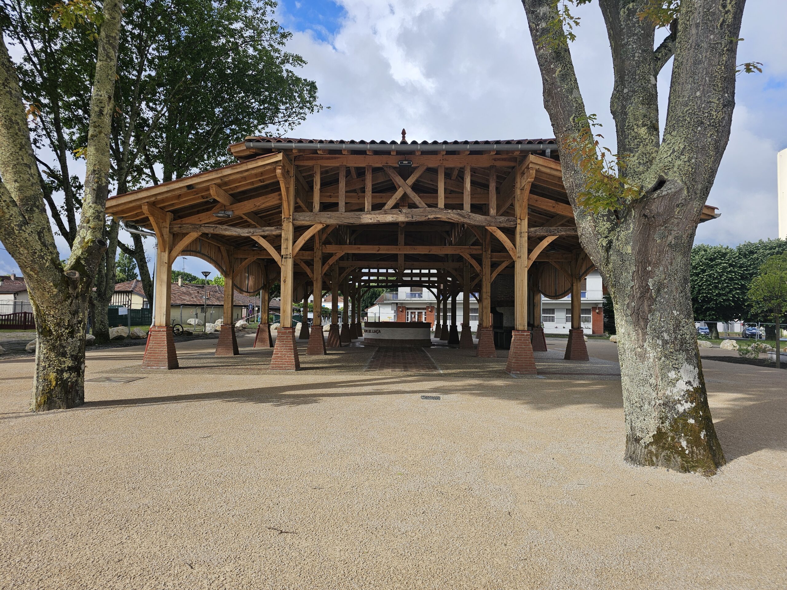 La construction évoque un hall gascon, une construction typiquement landaise à travers cette architecture civile. La simplicité se lit dans ses formes, pourtant sa mise en oeuvre relève d’une grande complexité. Posés sur des plots en briquettes, les portiques de bois ainsi que l’ensemble de la charpente sont réalisés avec du bois local. Il faut donc respecter les conditions de sciage ainsi que les longueurs de découpe malgré la grande superficie de l’édifice.