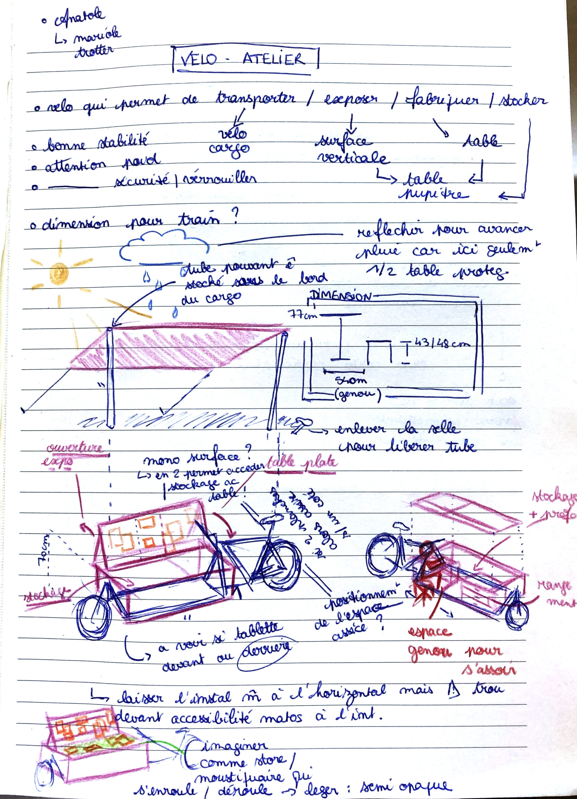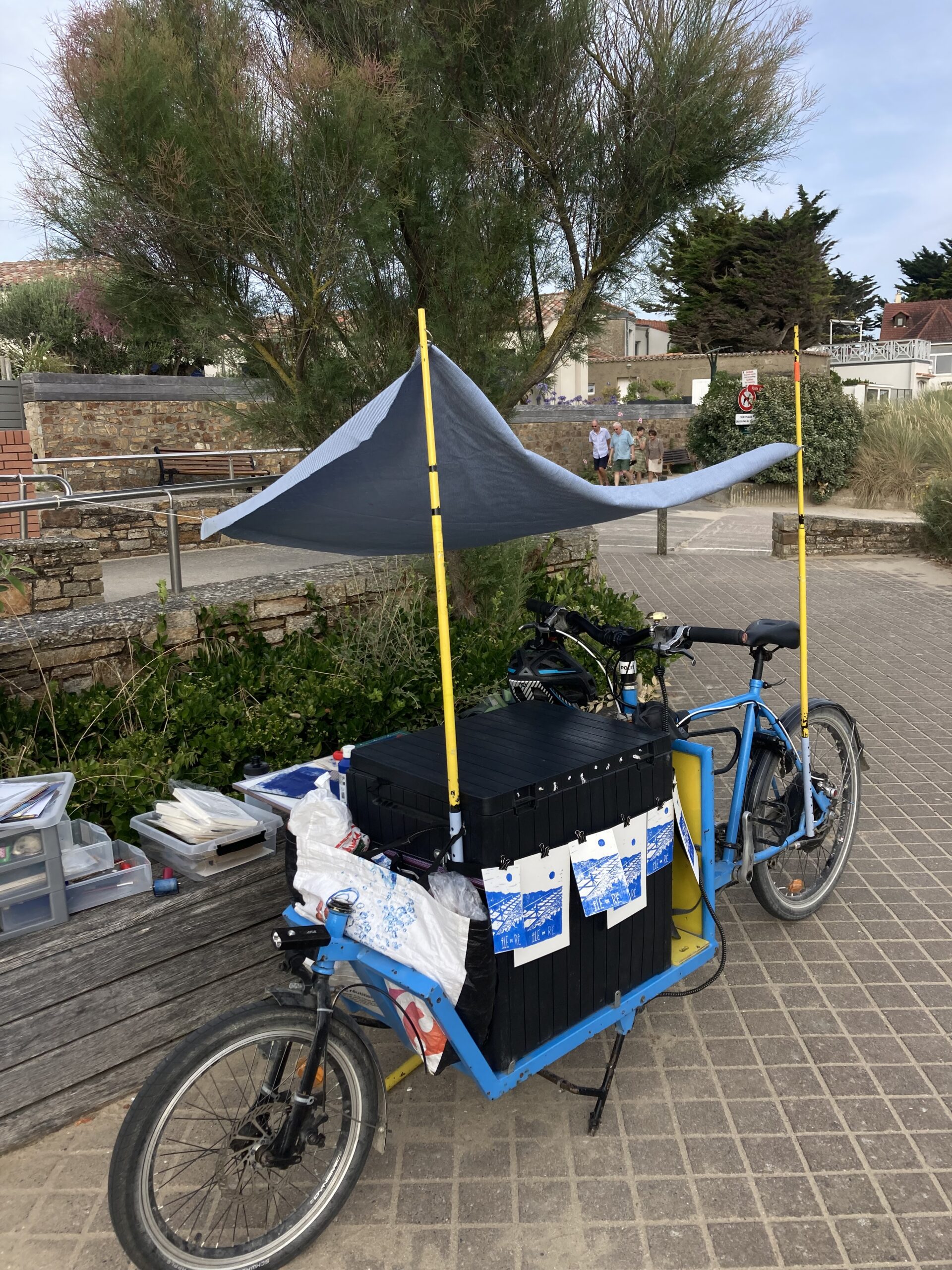 Sur la base d’un vélo-cargo, je suis venue créer une micro-architecture permettant d’accueillir une table et une voile d’ombrage, tout en ne contraignant pas la mobilité initiale du vélo. J’ai bricolé mon futur espace de création et de repas pour les mois suivants à partir d’éléments qui dormaient dans le garage de mes parents (cannes à pêche, coffre de jardin, ancienne crédence…).