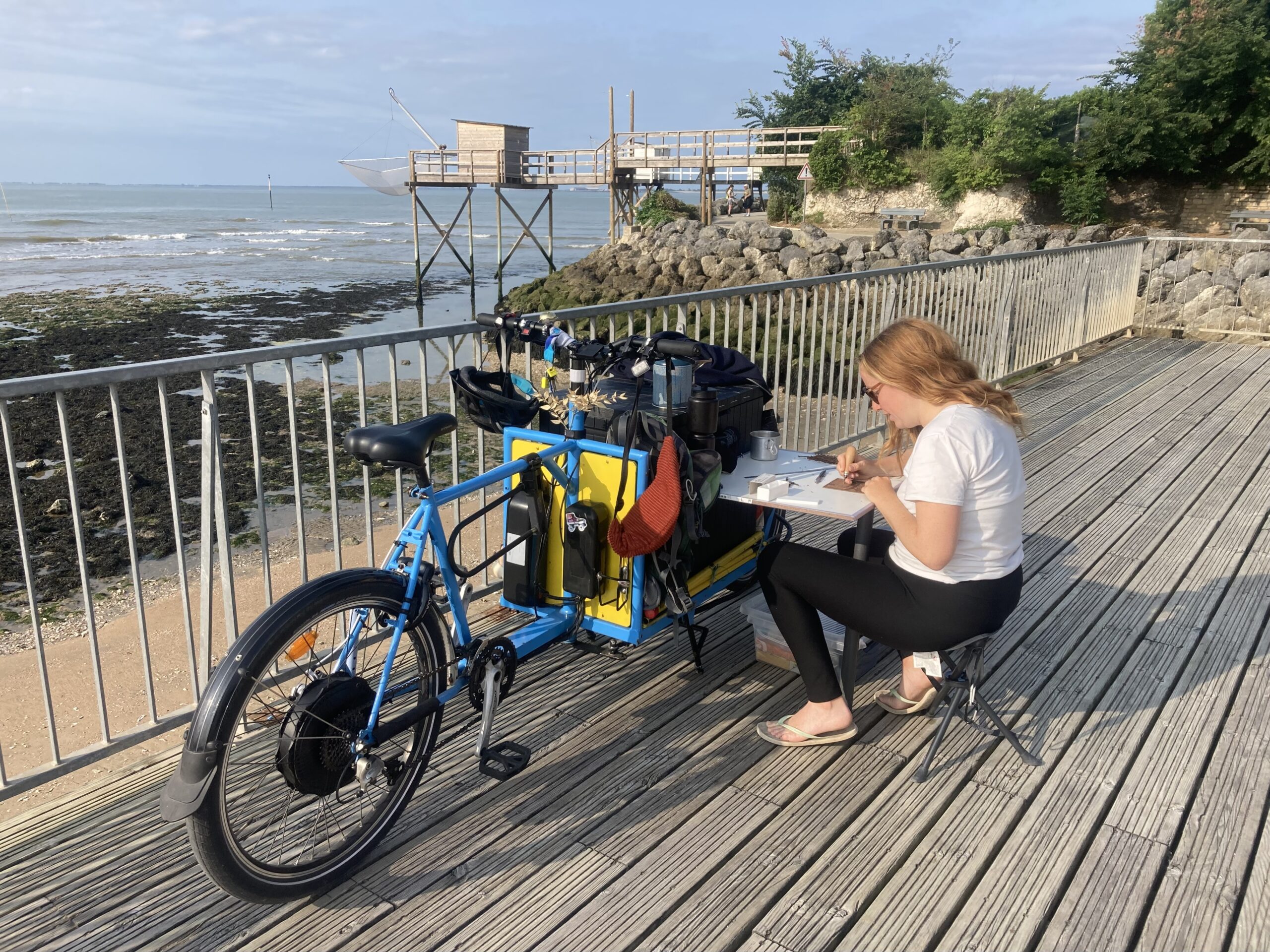 Avec mon atelier itinérant, je suis alors partie du Pays basque sans objectif précis de destination ou de distance ; je suivais simplement l’océan, ses plages, ses marées. Mes arrêts se faisaient selon les paysages, les rencontres, la météo ou mon moral. Ces pauses étaient l’occasion de belles rencontres avec les habitant·es et les touristes, interpellé·es par mon vélo, la linogravure ou le fait qu’une jeune femme voyage seule. J’ai vite compris que ce vélo, que j’avais imaginé comme un simple outil de mobilité, était finalement un vrai partenaire d’aventure, représentant la liberté, la lenteur, un lien vers les autres, un abri, un atelier et le contenant de tous mes besoins et créations pour ces deux mois.