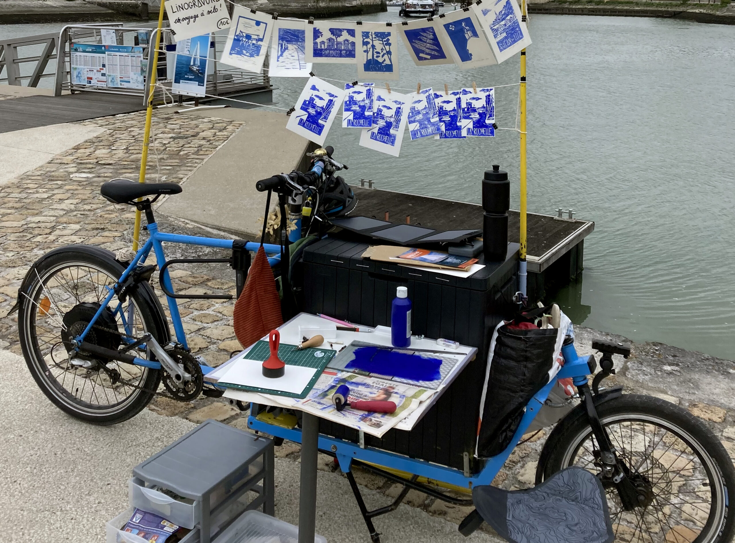 La Linodysée émerge d’une volonté personnelle de découverte, de représentation et de partage de ma vision du territoire côtier. Souhaitant sortir mes dessins de voyage de mes carnets de croquis habituels, je me suis tournée vers la gravure, et plus particulièrement la linogravure, pour son économie de moyens et son adéquation au nomadisme. Je voulais pouvoir créer partout, sans dépendre d’un lieu ni d’un mobilier, et me créer un atelier itinérant. Le vélo a découlé comme moyen de transport pour ce voyage, moins coûteux et polluant que la voiture, plus rapide que la marche et offrant l’opportunité de porter plus (mais pas trop).