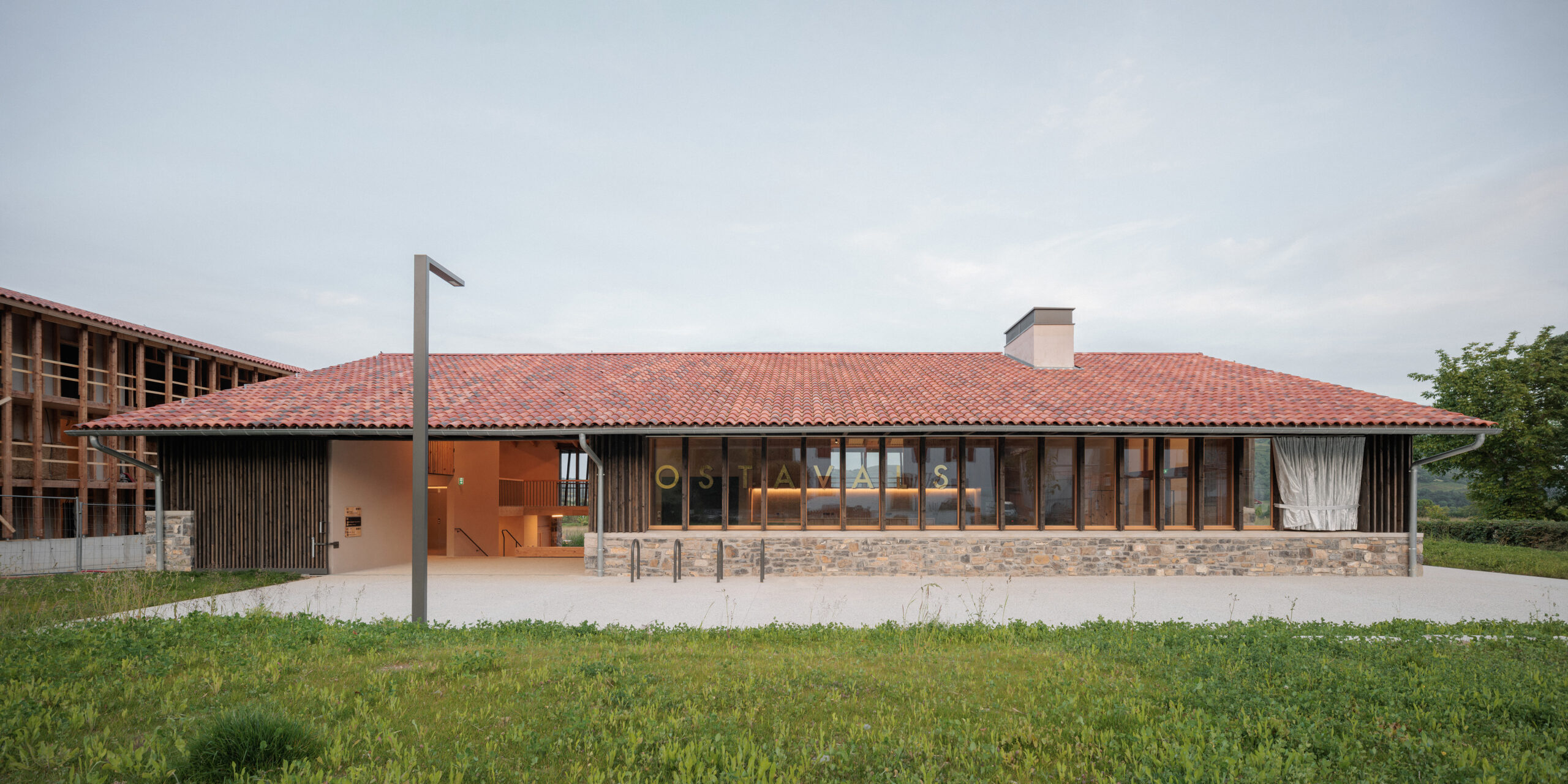 La Maison du Paysage à Ostabat-Asme s’inscrit comme un équipement signal sur le chemin de Saint-Jacques-de-Compostelle. Portée par le projet transfrontalier JACOB@CCESS, elle offre un accès inclusif au patrimoine rural, agricole et gastronomique du Pays Basque. Pensée dès sa conception selon une accessibilité universelle, elle propose des cheminements adaptés, une signalétique claire, un mobilier ergonomique et des contenus multisensoriels pour garantir une expérience partagée par tous. Plus qu’un lieu d’accueil touristique, Ostavals valorise les ressources locales et anime la vie du village. En rez-de-chaussée, un restaurant ouvert sur le chemin complète l’équipement, en proposant une cuisine issue de produits agricoles locaux et d’un potager partagé. L’architecture épouse la topographie et dialogue avec le paysage : deux niveaux desservis indépendamment s’articulent autour d’un large passage couvert, inspiré de l’« eskatz » basque, véritable colonne vertébrale qui relie zones techniques, restaurant, sanitaires et centre d’interprétation ouvert sur le grand paysage. La conception privilégie lumière et confort climatique. Une grande baie vitrée capte les vues et les apports solaires passifs, un avant-toit en bois protège du soleil estival et crée un espace intermédiaire accueillant. La matérialité affirme un ancrage territorial fort : socle en pierres de réemploi, bois de pin laricio issu de la forêt communale et valorisé localement, isolation et panneaux acoustiques en fibres de bois. Cette cohérence constructive exprime sobriété et durabilité, à laquelle s’ajoutent des dispositifs énergétiques partagés avec des logements inclusifs voisins : chaufferie bois, puits canadien et toiture photovoltaïque. Ancrée dans son territoire tout en affirmant une écriture contemporaine, la Maison du Paysage incarne une architecture au service de l’inclusion, de la transmission et de la transition écologique reliant habitants, pèlerins et agriculteurs autour d’un patrimoine vivant.