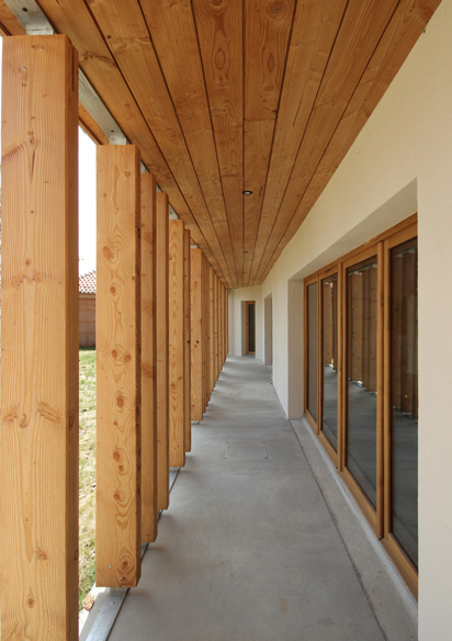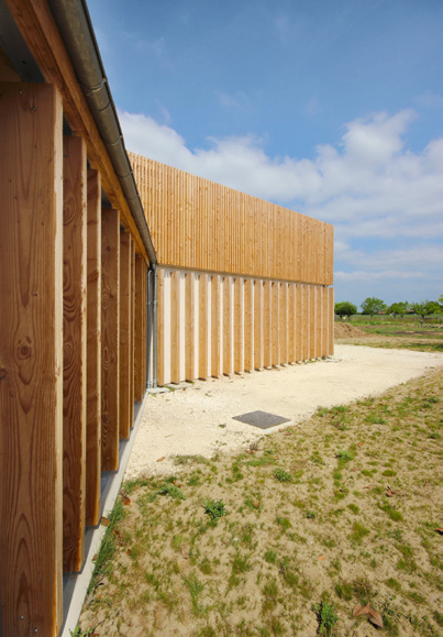 L’écriture architecturale met en cohérence l’ensemble : démolition des ajouts parasites, recomposition des façades, isolation par l’extérieur et bardage bois ajouré reliant les différentes entités. Les surfaces maçonnées sont enduites à la chaux, le hangar reçoit un habillage bois, et l’emploi de matériaux biosourcés est privilégié. Le chauffage et l’eau chaude sont assurés par une chaudière à pellets alimentée par les déchets bois de l’exploitation viticole.