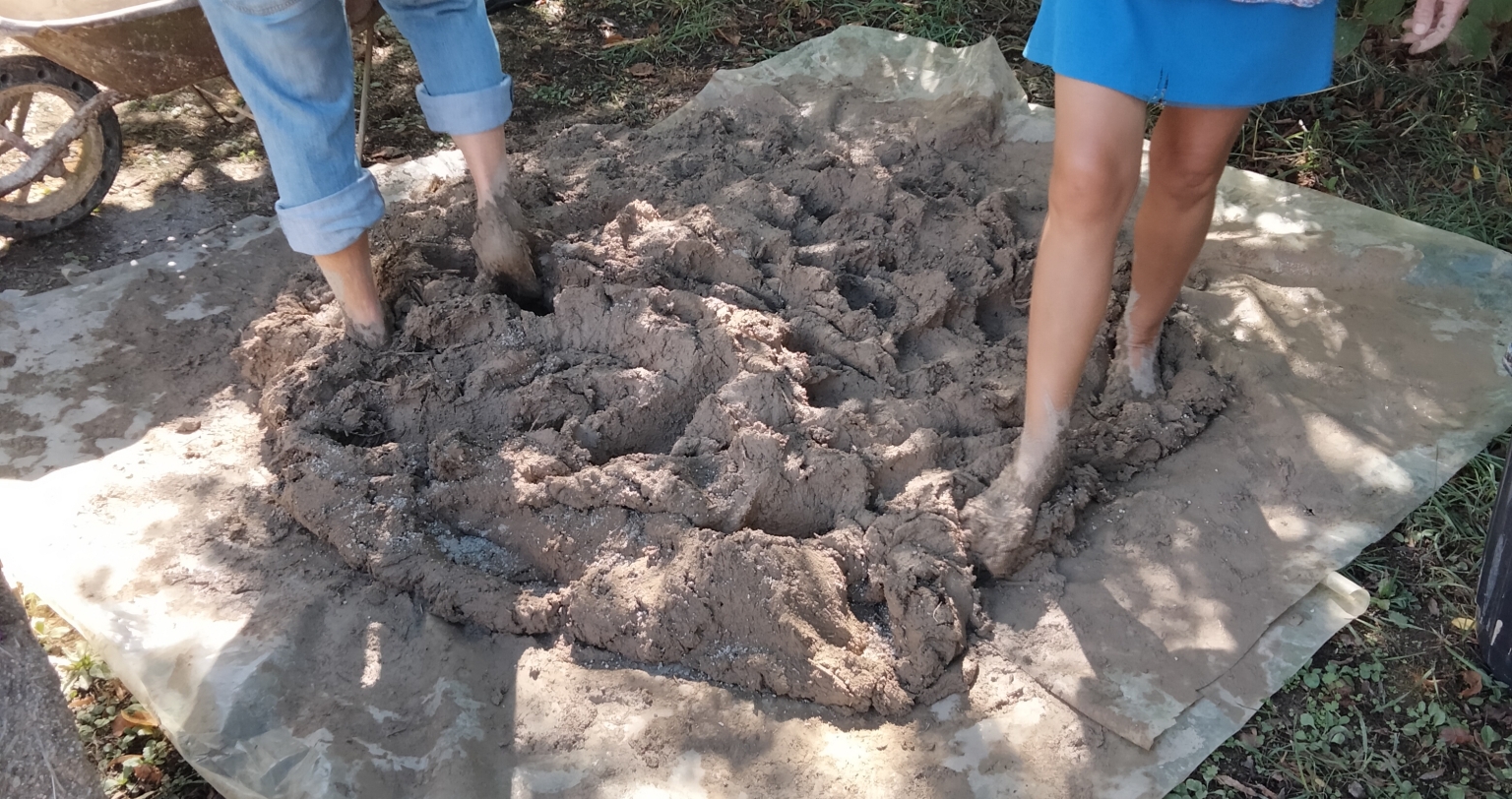 Préparation ancestrale de la terre crue destinée à la rénovation d’un mur du Patrimoine d’Ouzilly-Vignolles. Association CiTerre