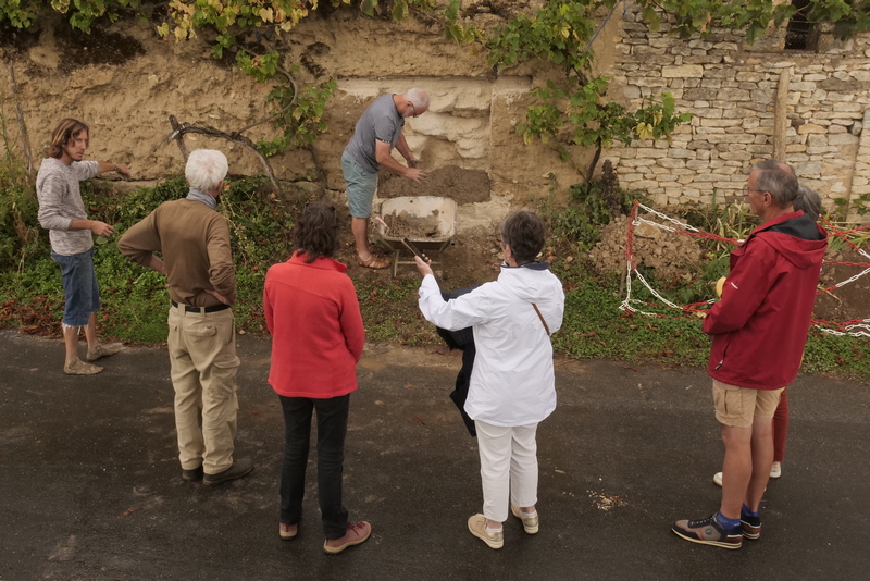 Projection manuelle de la terre crue réalisée par un visiteur lors de la rénovation d’un mur du Patrimoine. D’Ouzilly-Vignolles. Association CiTerre