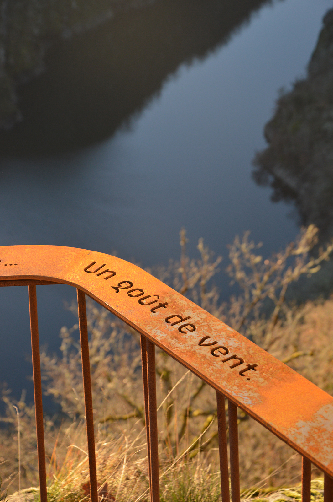 garde corps en acier brut, typographie spécifique d'Adrien Aymard, citation de Marcelle Delpastre Adrien Aymard - atelier du sillon - Site de Saint-Nazaire, Sarroux Saint-Julien, 2023